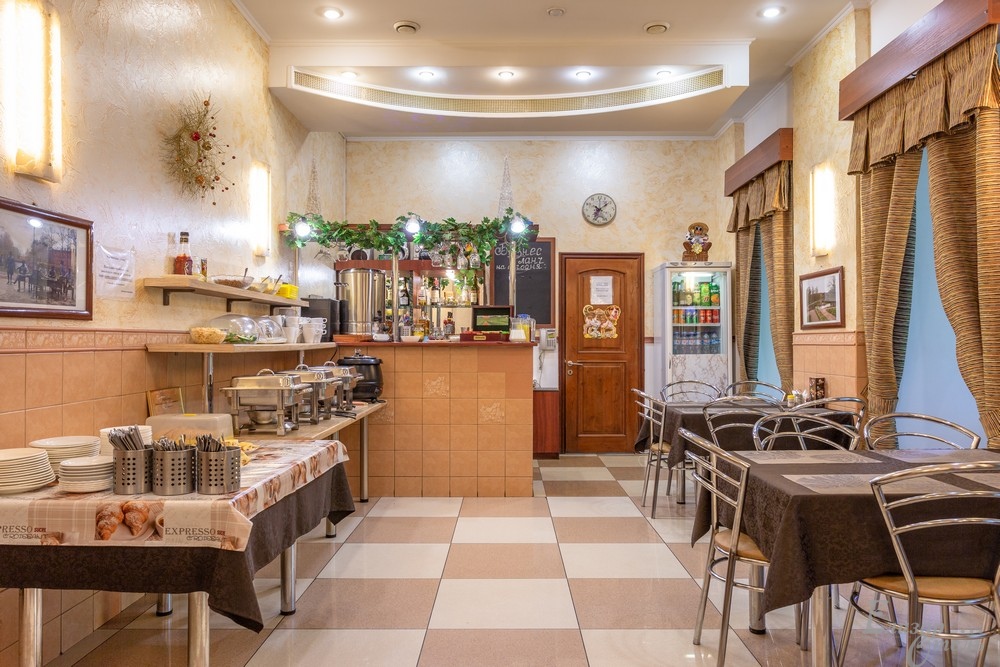 Так как у нас своя кухня, Вы можете не только позавтракать, но и пообедать и поужинать прямо в отеле. Здесь удобно посидеть с деловыми партнерами или друзьями. Пространство кафе организовано так, что здесь удобно организовать деловые переговоры и встречи.