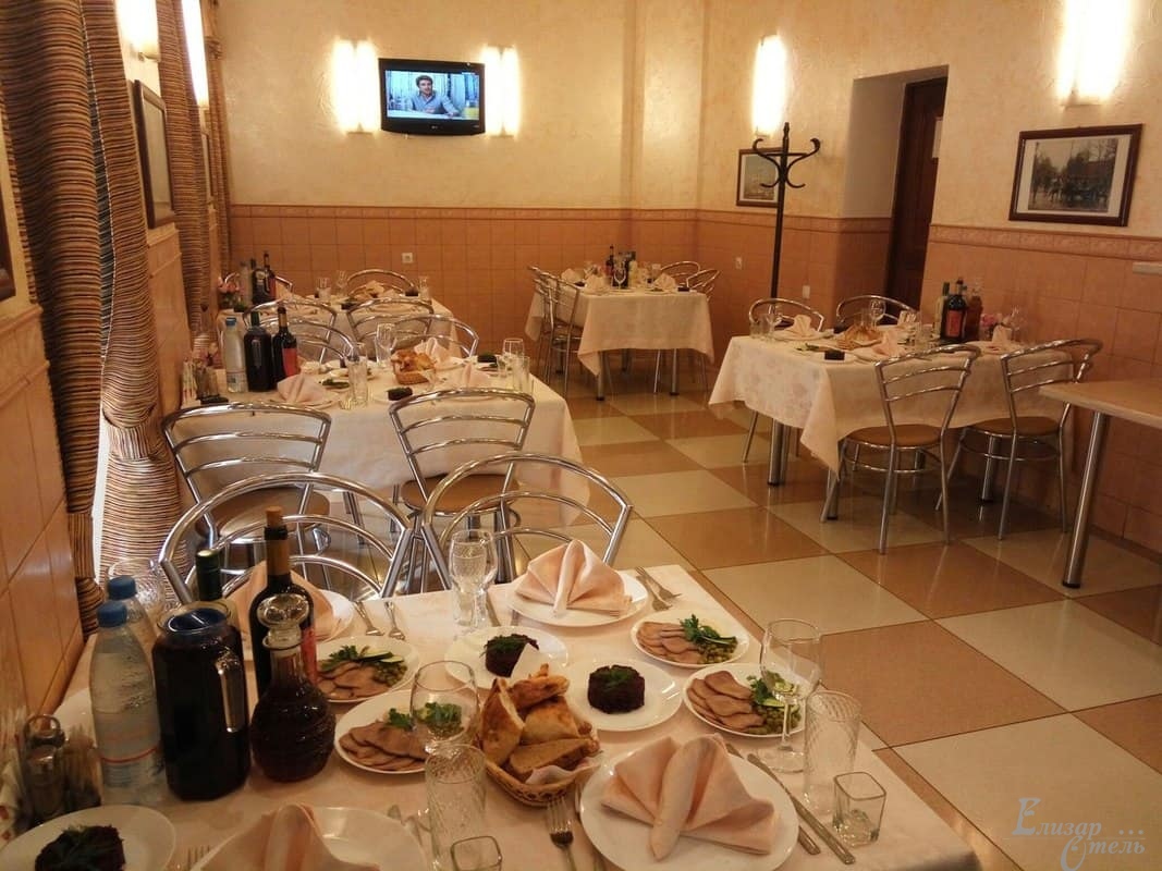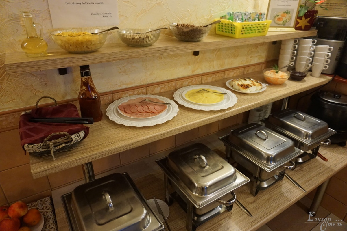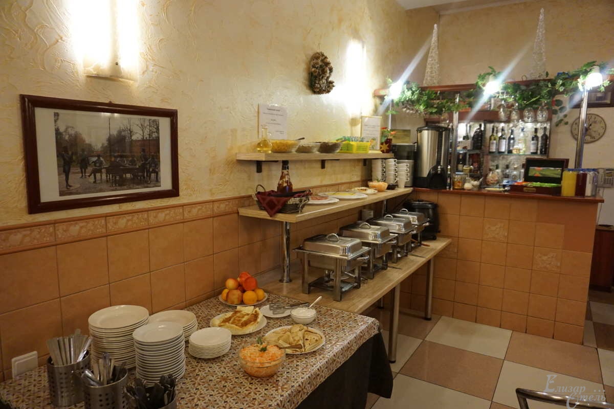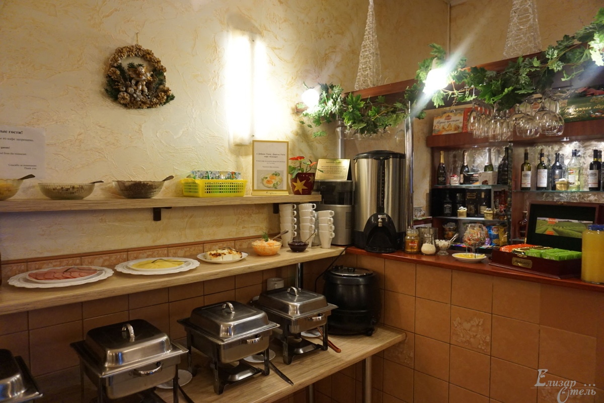 «Елизар-отель» в отличие от многих небольших гостиниц, где все питание разогревается в СВЧ-печке, имеет свою собственную замечательную кухню с очень умелыми и достойными поварами. Для всех постояльцев отеля предоставляется завтрак по типу «шведский стол» с горячими и холодными блюдами, салатами и разнообразными напитками.