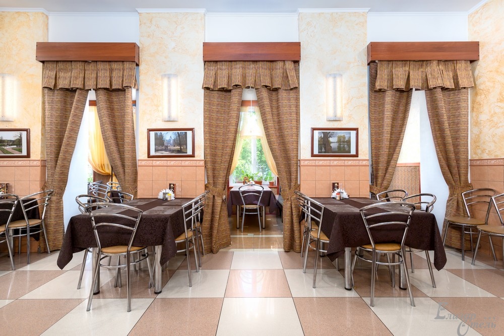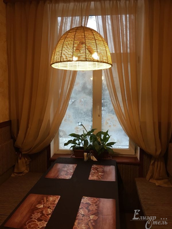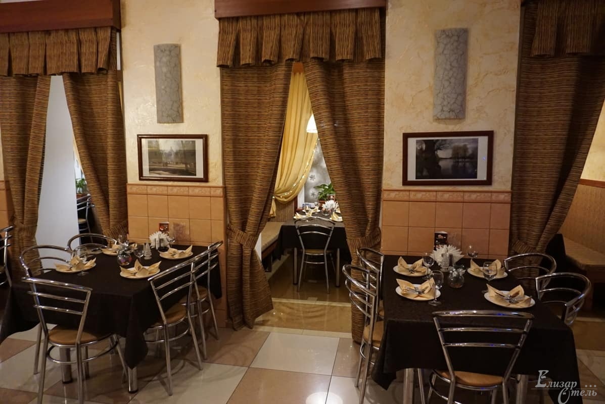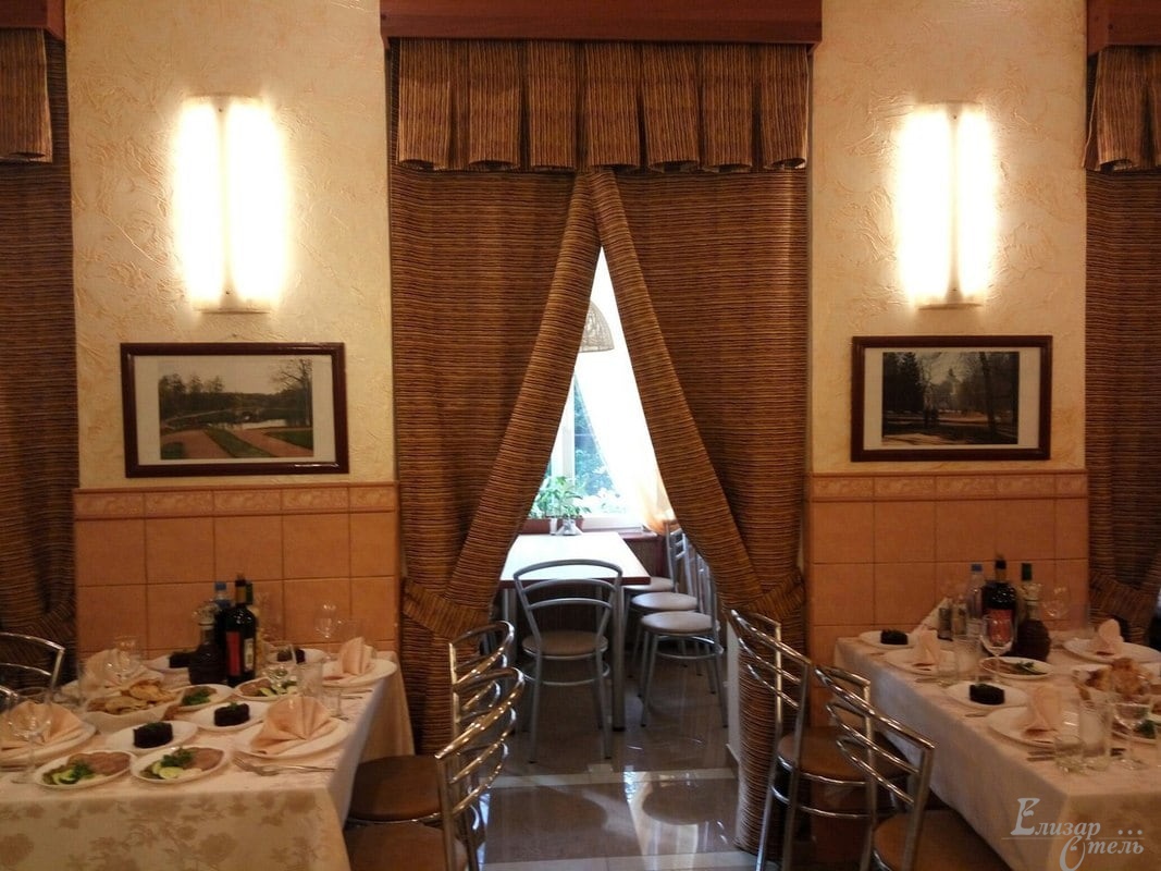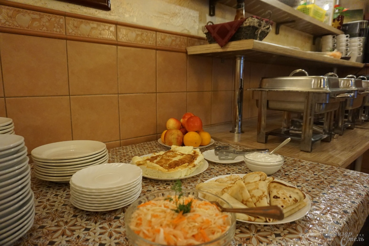 «Елизар-отель» в отличие от многих небольших гостиниц, где все питание разогревается в СВЧ-печке, имеет свою собственную замечательную кухню с очень умелыми и достойными поварами. Для всех постояльцев отеля предоставляется завтрак по типу «шведский стол» с горячими и холодными блюдами, салатами и разнообразными напитками.