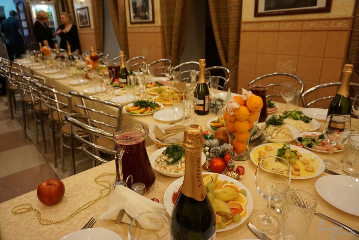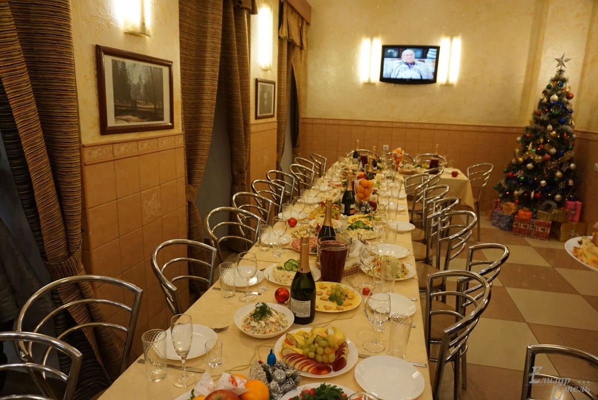 В небольшом, но уютном банкетном зале «Елизар-отеля» есть все необходимое для проведения свадебного торжества, юбилея, корпоративного мероприятия или детского праздника. Вместимость зала – до 25 человек